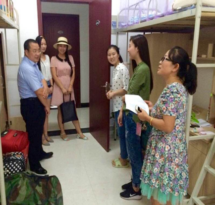 李万强副院长仔细查看了同学们的住宿条件,每走进一间宿舍,都向同学们致以亲切的问候,并代表学院对同学们的到来表示热烈的欢迎。继而关切地询问她们的具体情况,来自什么地方、入学手续办理的情况等。同时,张乃钟老师细心地询问同学们是否适应新的环境,有什么困难,希望同学们遇到问题一定要与老师沟通。随行的学生干部,也借此机会认识了法学院注入的新鲜血液,与新生热情得展开交流。