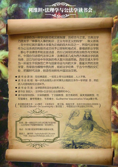 基于以上种种考量,并配合学校“思想交大”建设和学院法理学和公法学的学科建设,法学院“立法与社会治理研究中心”发起创办“利维坦·法理学与公法学读书会”系列活动。本学期该活动选取的经典文本为让·博丹的《主权论》,并于10月18日晚7时在学院会议室举行了首场活动,法学院丁卫副教授、吉兰湘老师、彭何利博士、苏青博士、王朝恩博士、卞苏博士、唐学亮博士等10余位师生参加。主权理论是现代民族-国家兴起的理论前提,而民族-国家又是现代社会最重要的一个政治与法律现象,并与中国近代以来持续至今的伟大而艰难的国家转型勾连起来,因此,不得不察。在该场读书会活动中,主讲教师唐学亮针对博丹《主权论》一书的“导论”部分,就“为什么读博丹?”、“怎么读博丹?”、“博丹的思想里程与理论建构”以及“博丹理论的缺陷”等四个方面做了一个提纲挈领而又不失理论深度的学术报告。之后,就报告的内容及书中所启示的一些重大理论与现实问题,与会人员各自发表了自己的看法,并展开了热烈的讨论。首场读书会活动取得了预期的效果,我们将在两周后的同一时间举行第二场活动。“路漫漫其修远兮,吾将上下而求索”!