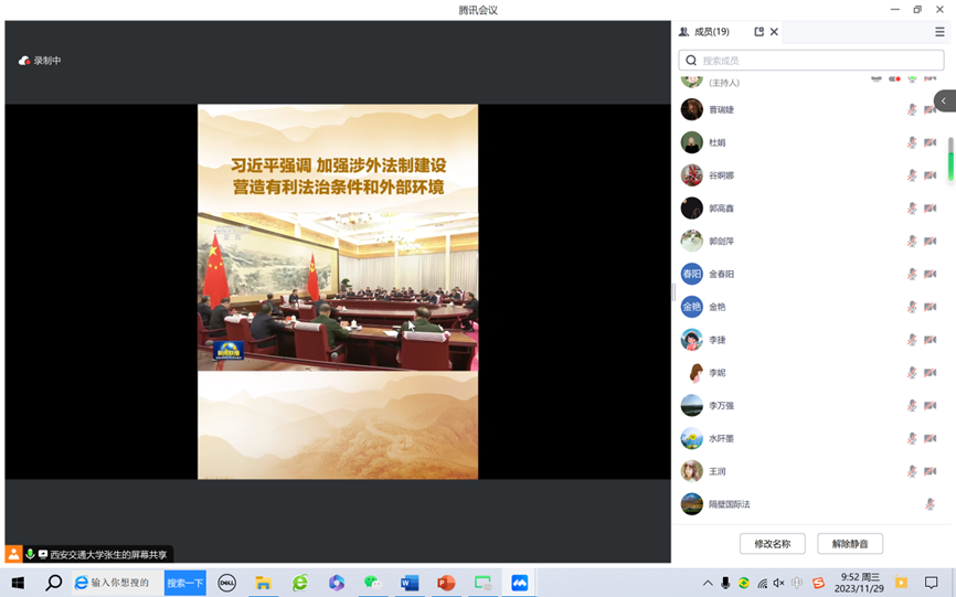11月29日上午,法学院国际法所党支部召开专题组织生活会,集体学习习近平总书记在主持中共中央政治局第十次集体学习时重要讲话精神。会议以线上线下相结合的方式进行。
