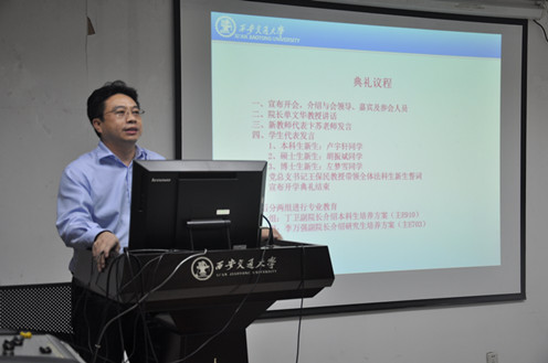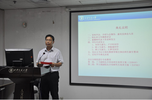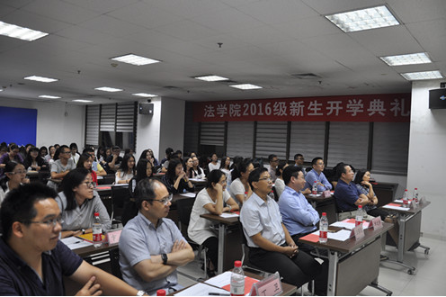 9月18日晚,法学院2016级新生开学典礼在主E703隆重举行。院长单文华教授,党总支书记王保民教授,副院长李万强教授,副院长丁卫副教授,院长助理吉兰湘老师和苏金远教授,院工会主席张弘副教授,文治书院院务副主任郭小平老师,院办主任张美萍老师,法学复合51班班主任薛华、唐学亮老师,法学61班班主任王玉苹、卞苏老师以及全体2016级本科、硕士、博士生新生参加了开学典礼,会议由学院学生工作专职委员张乃钟老师主持。