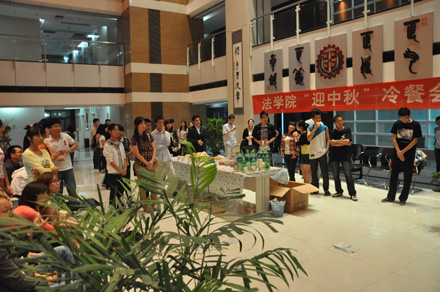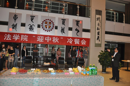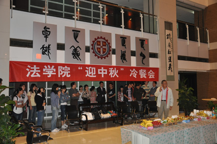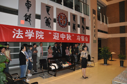 2011年9月8日19:30,法学院 “迎中秋”冷餐会在主楼十楼大厅举行。法学院院长单文华、书记彭沪生、院长助理吉兰湘、刘桥教授和学生工作专职委员张乃钟老师及法学院2011级全体本科生,硕士、博士研究生新生参加了冷餐会。冷餐会由2011级法律硕士新生马沙和马骏飞同学主持。