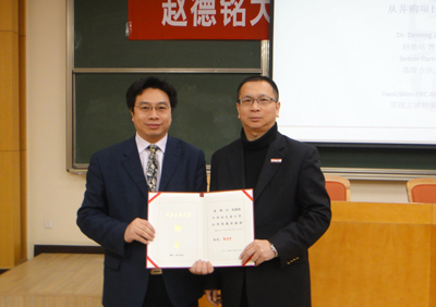 日前,上海昊理文律师事务所高级合伙人赵德铭律师来我院访问。12月20日下午,在主楼A103教室,赵德铭博士受聘为我校兼职教授,并面向法学院师生做 《高端法律服务市场上商务律师的典型与非典型特征——从并购项目谈起》专题学术报告。法学院院长单文华教授向赵博士颁发了兼职教授证书,并为赵博士佩带了校徽。授聘仪式由法学院副院长王保民教授主持。