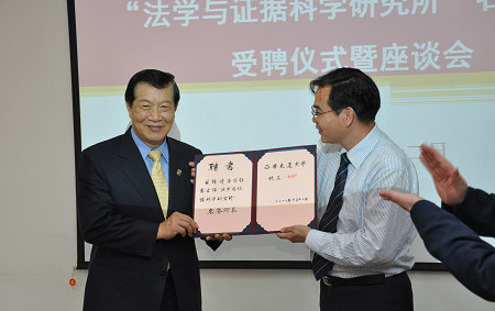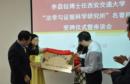 10时整,李博士的受聘我校“法学与证据科学研究所”(ILES,“法证据所”)名誉所长仪式在主楼E910会议室隆重举行。仪式由法学院院长单文华教授主持。徐宗本副校长、国际处梁莉处长、法学院党委书记彭沪生、ILES所长李生斌教授和马治国教授以及法学院王保民副院长出席了仪式。在热烈的掌声中,徐宗本副校长代表学校向李昌钰博士颁发了聘书,并同李博士一起为我校“法学与证据科学研究所”揭牌。李昌钰博士将一条美国康州警政厅的警官领带赠与徐宗本副校长,他还向在场的其它几位学院领导赠送了礼物。徐副校长发表了热情洋溢的讲话,他首先对李博士的访问表示感谢,并对李博士的受聘表示祝贺,希望李博士能把他的真知灼见,经验智慧传授给我校广大师生。他指出,“事是靠人做出来的”,希望在李博士的指导和支持下,法学院和医学院法医学科充分发挥各自优势,把“法学与证据科学”这个新兴的交叉学科做好做强。李博士也发表了热情洋溢的讲话。他首先以DNA立法为例,充分肯定了法学与法医学开展学科合作,成立法学与证据科学研究所的重要意义。他指出当代科学研究的发展已经把两个学科紧密地联系在一起,法学和法医携手开展证据科学等交叉学科研究,是两个学科保持前沿性,培植学科新增长点的重要举措。他表示,“能够担任贵所所长是我的荣幸”。他说,“很多地方想以我的名字命名成立研究所等,但我都拒绝了。我想,以人的名字命名很容易,但一个人要想真正做点事却很难。就像生小孩一样,要培养他,让他健康成长,所以,我以后会尽力为大家做好服务,也欢迎大家到美国,到我的学校来。”随后,李教授与法学院师生进行一场以“法学与证据科学”为主题的座谈会。座谈会上,李博士幽默风趣,侃侃而谈。老师和同学们踊跃发言,与李博士的讨论热烈而有趣。最后,单文华院长作了总结发言。老师和同学们意犹未尽,都觉得学到了很多书本上没有的知识。