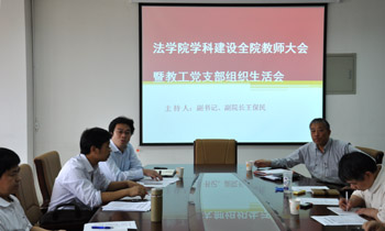 最后,法学院教工党支部召开组织生活会。会上,教工支部书记吉兰湘对本学年教工支部组织生活进行了安排部署。接着,彭沪生书记传达了教育部袁贵仁部长争先创优视频会议讲话及学校工作部署,并以“搞好反腐倡廉,促进科学发展”为主题为学院全体党员上了一堂严肃而有教育意义的廉政党课。