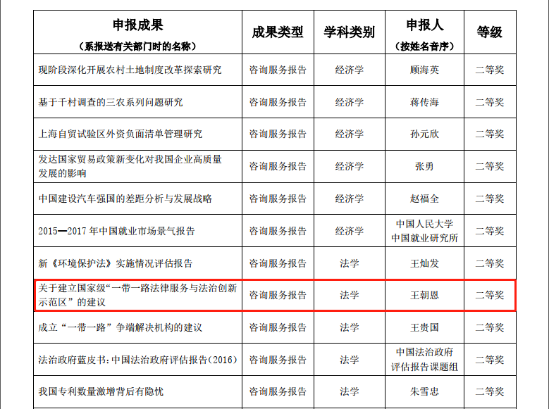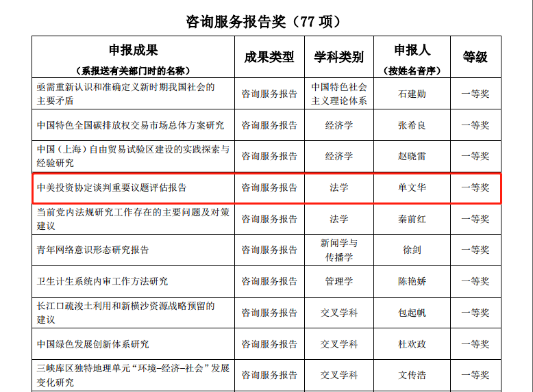 其中,法学院院长单文华教授主持撰写的《中美投资协定谈判重要议题评估报告》荣获咨询服务报告类一等奖——这是该类型全国仅有的两项法学类一等奖获奖成果之一,也是西安交大在该奖项一等奖上的首次突破。同时,由单文华院长和王朝恩副教授等合作撰写的《关于建立国家级“一带一路法律服务与法治创新示范区”的建议》荣获咨询服务报告类二等奖,是全国5项法学类二等奖成果之一。