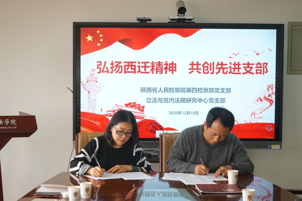 立法与党内法规中心党支部与陕西省人民检察院第四检察部党支部举行了以“弘扬西迁精神,共创先进支部”为主题支部联合共建座谈交流活动,并签署支部共建协议。大家一致希望通过相互交流、相互促进的方式,利用各自优势,形成支部之间、党员之间的良性互动,以支部共建带动检察实践、课题研究等多方面的合作。此次党支部联合共建活动成功举办,为贯彻落实党的各项方针政策提供了更好的交流平台,我们两个党支部都希望以此为契机,携手奋进,围绕各项中心工作发挥好基层党支部的战斗堡垒作用,共创先进党支部。