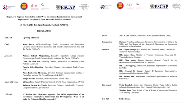 2021年3月30日下午,“WTO投资便利化促进发展谈判区域高层圆桌会议:亚太经济体的视角”在泰国曼谷成功举行。乐动网页版法学院院长单文华教授应邀参加并作“WTO投资便利化谈判所面临的挑战”的大会发言。此次会议由联合国亚洲及太平洋经济社会委员会(亚太经社会ESCAP)和世界经济论坛(WEF)、联合国国际贸易中心(ITC)、德国发展研究院(DIE)、东南亚国家联盟(东盟ASEAN)联合举办,参加会议的包括亚太地区各国商务部长、驻WTO大使、主要相关国际机构代表、投资促进和私营部门代表以及本领域的领军学者代表。会议的主旨是为争取WTO投资便利化谈判在年内取得重大进展加强共识。