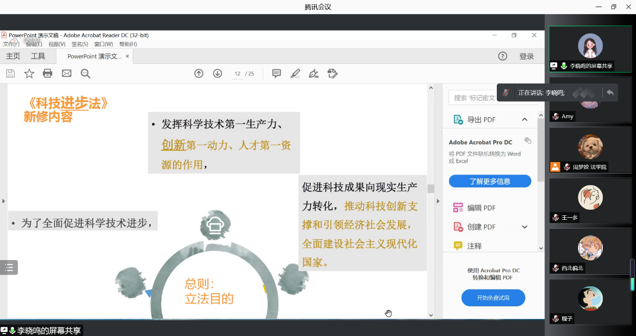 2022年1月9日晚上,乐动网页版法学院知识产权研究中心李晓鸣副教授对修订后的科技进步法的背景、新旧科技进步法的内容进行了对比,并对新科技进步法的亮点进行了详细介绍。同学们表示收获颇丰。