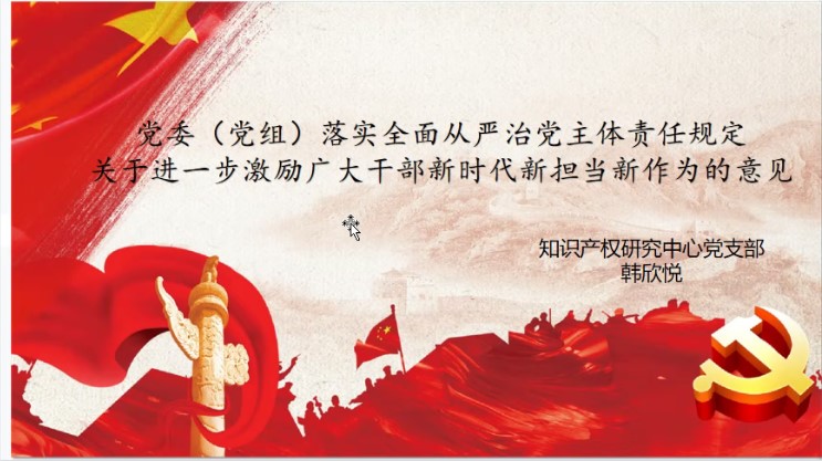 9月29日,知识产权研究中心党支部召开了“学习系列重要文件精神,迎接党的二十大”主题组织生活会并组织党员开展了批评与自我批评。支部书记周方教授主持会议。