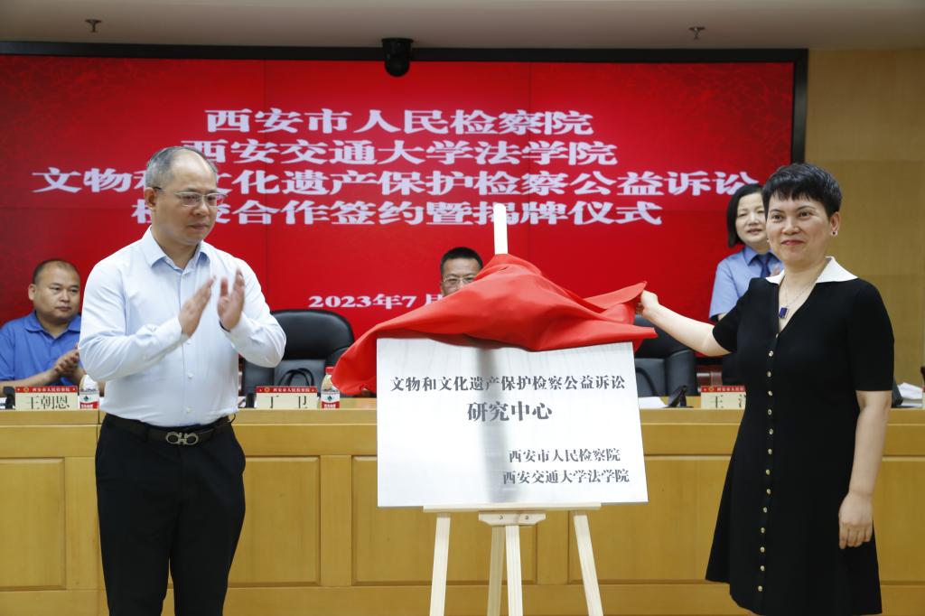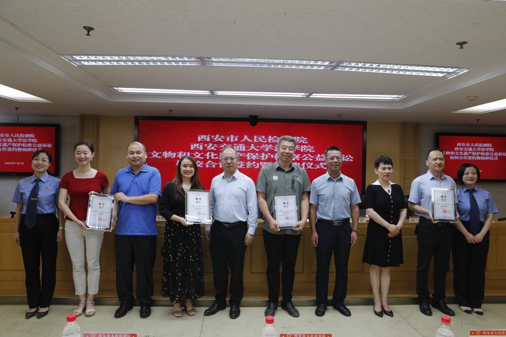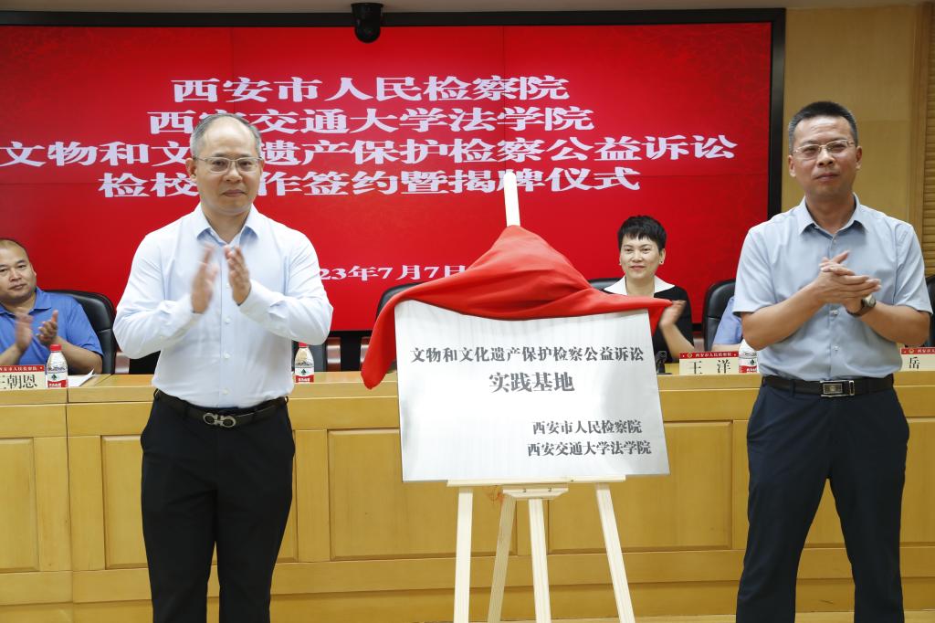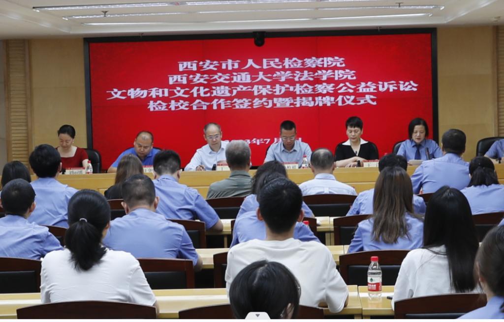 7月7日,西安市人民检察院、乐动网页版法学院共同举办“文物和文化遗产保护检察公益诉讼”检校合作签约暨揭牌仪式。陕西省人民检察院第八检察部主任王洋、西安市人民检察院副检察长韩柏超等领导,西安市人民检察院第八检察部全体干警、各区县院分管副检察长、公益诉讼部门负责人及实务研究员、乐动网页版法学院副院长丁卫、乐动网页版法学院的王朝恩研究员、刘丽娜副教授、特聘专家研究员代表以及西交大法学院首批11名实习生出席仪式。