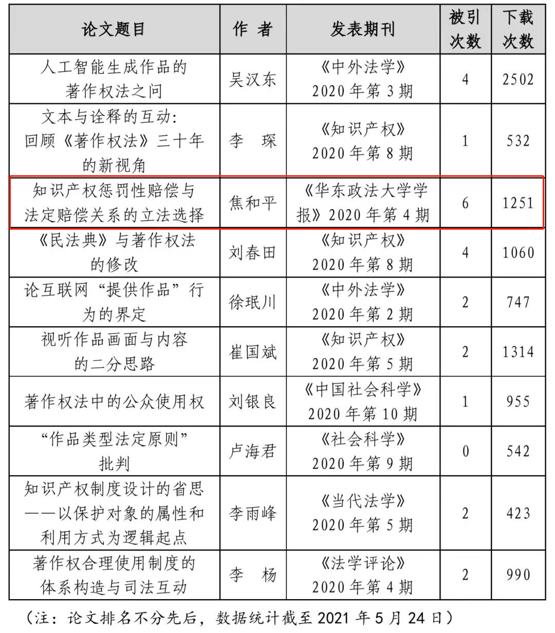 此前焦和平教授发表于《华东政法大学学报》2020年第4期的《知识产权惩罚性赔偿与法定赔偿关系的立法选择》入选“2020年度著作权热点问题研究十佳论文”,系第一年入选。