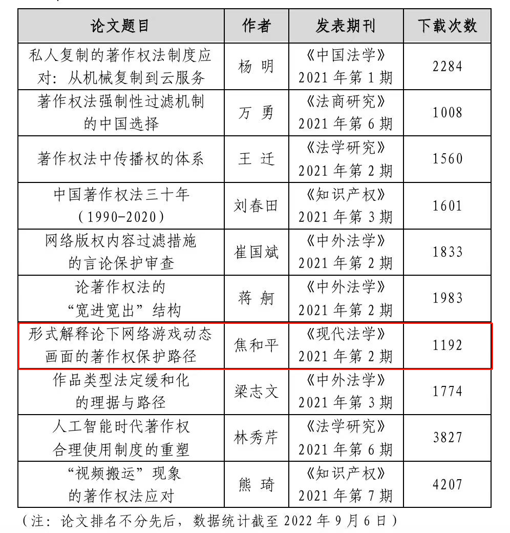 这是焦和平教授的论文连续第三年入选“年度著作权热点问题研究十佳论文”,此前焦和平教授发表于《现代法学》2021年第2期的《形式解释论下网络游戏动态画面的著作权保护路径》入选“2021年度著作权热点问题研究十佳论文”,系第二年入选。