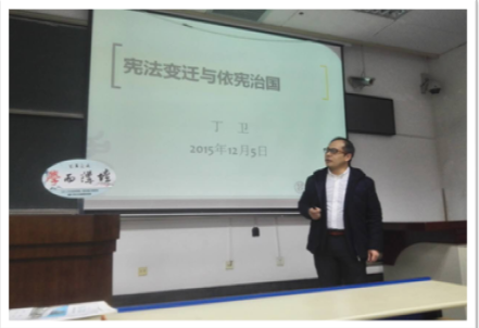 法学院研究生会、法律爱好者协会携手“学而讲坛”,推出“国家宪法日”专题讲座,邀请法学院副院长丁卫副教授就《宪法变迁与依宪治国》进行专题讲座。丁老师在讲座中详细介绍了我国现行宪法历次修改的过程,他结合历次宪法修改的历史背景,生动地讲述了我国宪法变迁的历史发展,他最后对我国宪法实施中存在的瓶颈及问题进行了透彻的分析和讲解,为大家展示了依宪治国的现状及前进方向。
