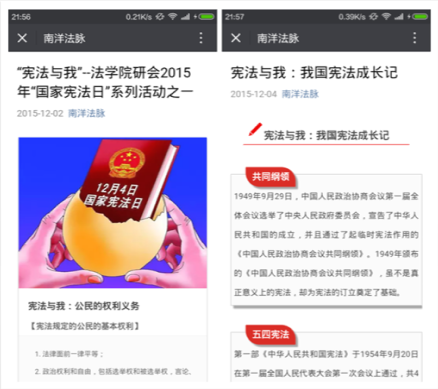 为了配合“国家宪法日”系列主题活动的顺利开展,乐动网页版法学院研究生会在院党总支、团工委的指导下,以“宪法与我”为主题,不断创新宣传载体,探索宣传方法,通过官方微信平台“南洋法脉”等新媒体,结合传统的发放传单等方式,积极推介“国家宪法日”相关内容,宣传法学院开展宪法学习宣传教育活动的实际情况,取得了良好的宣传效果。