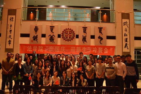 9月29日晚,主E10楼大厅灯火辉煌,暖意融融。法学院 “庆国庆、迎新生”冷餐会在这里隆重举行。院长单文华,党总支书记王保民,院长助理吉兰湘,院工会主席张弘、学生工作专职委员张乃钟、留学生教务高逸哲及法学院2016级全体新生参加了本次冷餐会。主持人由来自澳大利亚的留学生多米尼克、泰国的留学生刘美恩以及硕士一年级新生刘静洁和任丹伟担任。畅雅琛同学演奏的古筝名曲《雪山春晓》拉开了冷餐会的序幕。