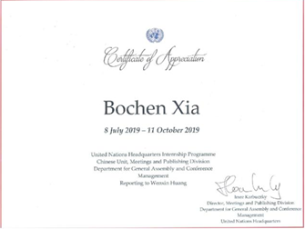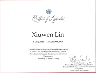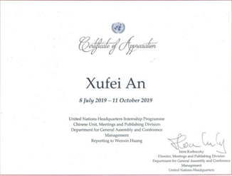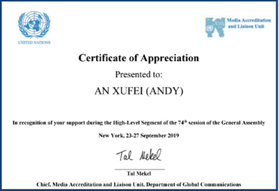 实习期间正值第74届联合国大会的召开,我校三名实习生有幸承担了联合国秘书长工作报告中文译本的编校工作,并通过了联合国全球传播部的选拔成为本届大会的志愿者,荣获“优秀志愿者证书”。法学院博士生夏伯琛感言:“终于有机会可以为祖国做一点力所能及的事,我们会主动引导前来参会的中国代表和媒体到达指定会场。最激动人心的是现场聆听国务委员王毅和联合国秘书长古特雷斯在新中国成立七十周年成果图片展开幕式上的致辞,向世界各国友人分享中国发展进步的辉煌成就。作为一名中国志愿者,强烈的民族自豪感油然而生!”