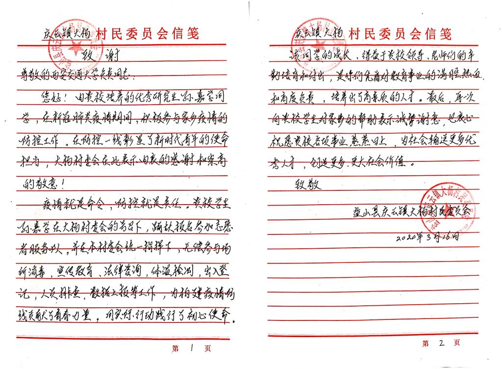近日,一封特殊的来信悄然落至交大。西交法学院学生——孙嘉学在家乡疫情防控攻坚战中不仅身体力行做好各项基础工作,更发挥自身专业为群众普及相关法律知识,为控制疫情贡献青春力量。庆云镇大杨村特向乐动网页版邮寄了一封手写感谢信,字里行间饱含对交大领导、老师的真挚谢意。
