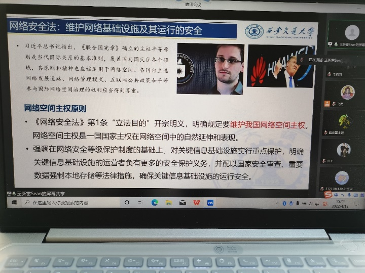 4月13日,法学院组织各党支部一同观看乐动网页版全民国家安全教育普法讲座。由于疫情原因,本次讲座采取线上模式。讲座中,王新雷老师对“新时代我国数据安全、隐私保护的法律成就与个人担当”这一专题进行详细讲解,各位同学都获益匪浅。